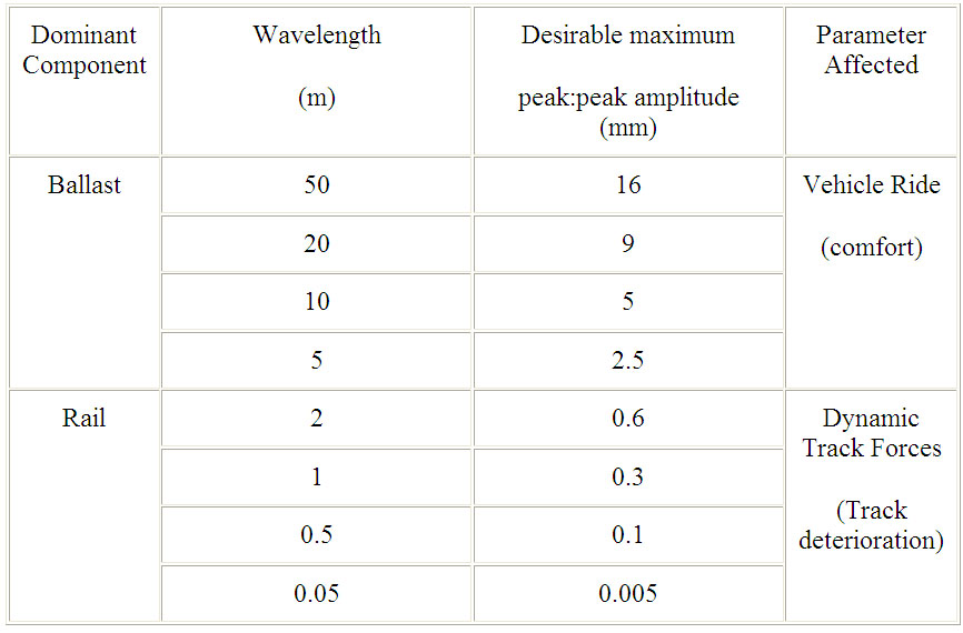 The minimum permissible track standard will depend upon the type of traffic, passenger/freight and its speed. For passenger trains, travelling at 200km/h, Selig and Waters (1994) present limits on vertical smoothness in Table 2.2.
