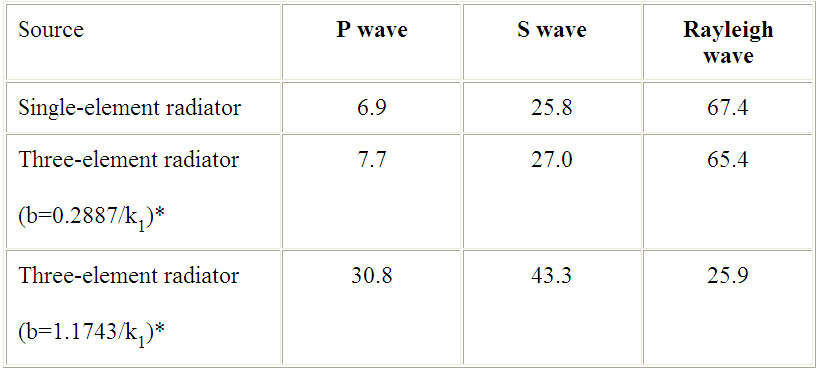 Here we see that for a single point source the majority of the energy is transmitted away as Rayleigh waves. However it is significant to note that at a given frequency and therefore wavelength, three individual point sources can be arranged, such that when they are distributed equally along the circumference of a circle of radius b, an equivalent distribution of energy amongst the three wave types can be achieved to that obtained from an individual point source (compare row one and two of Table 2.4). However a fourfold increase in this radius can change the dominance from Rayleigh waves to Body waves (compare row two and three of Table 2.4).